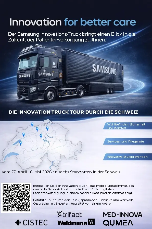 Im April–Mai 2026 tourt der Samsung Innovation Truck durch die Schweiz und macht Innovation im Gesundheitswesen hautnah erlebbar. Gemeinsam mit starken Schweizer Partnern – darunter Samsung, trifact, Cistec, Qumea & Waldmann – zeigen wir, was heute bereits möglich ist: von modernster Technologie bis zu integrierten digitalen Gesundheitslösungen.